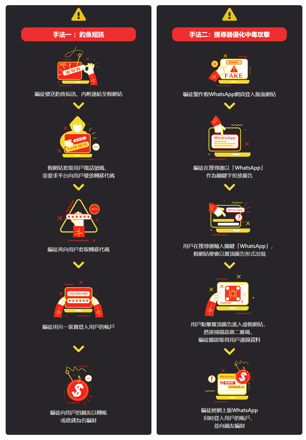 2023年8月開始出現新型帳戶騎劫手法。新手法利用釣魚白撞訊息,後來演變為「搜尋器優化中毒」的攻擊。當中大部分的案件涉及WhatsApp帳戶,亦有小量涉及Telegram和其他網上平台。